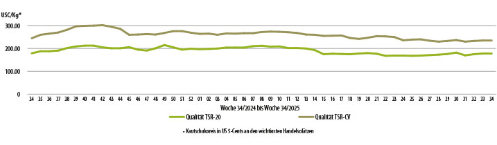 Der internationale Kautschukmarkt zeigte sich im Berichtszeitraum insgesamt stabil mit leicht fester Tendenz. Der Durchschnittspreis für das Standardprodukt TSR-20 lag mit 178,29 US-Cents je Kilogramm rund drei Prozent höher als im vorangegangenen Zeitraum. Während in Europa und Nordamerika die Nachfrage eher verhalten blieb, stabilisierte China mit deutlich größeren Volumen das internationale Preisgefüge. Gleichzeitig erschwerten in mehreren asiatischen Produktionsländern anhaltende Regenfälle die Rohstoffgewinnung, was die Angebotsseite schwächte. Gegen Ende des Berichtszeitraums sorgten zwar verbesserte Wetterbedingungen in einzelnen Anbaugebieten für etwas Entlastung. Da aber gleichzeitig in China die landesweite Ferienwoche „Golden Week“ begann, in welcher der chinesische Handel weitgehend ruhte, bewegte sich der Markt in dieser Phase seitwärts.